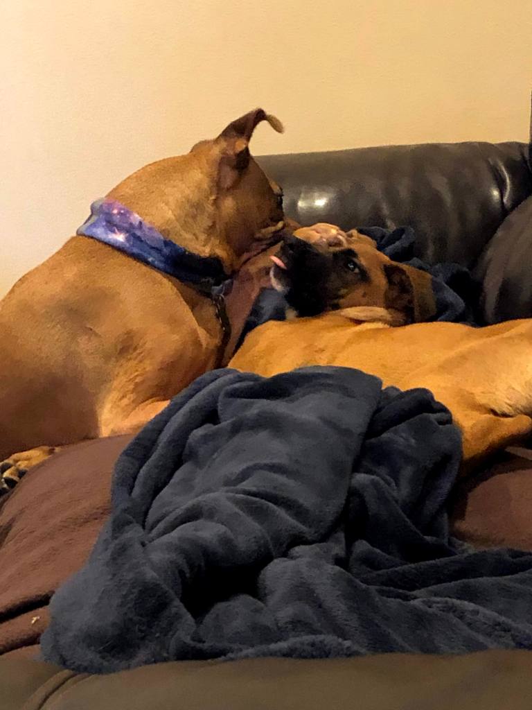 We gave them space, and they started to acclimate. Until Penny tried to play with her, and Ginger snapped back in fear. What have we done? I thought as I held Ginger while Court pulled Penny away. We had always decided that we would only get a new dog if it was right for Penny, because she was our first dog and this was her home. There was nothing to be done that night, so we put Ginger in her kennel and everyone slept on it.