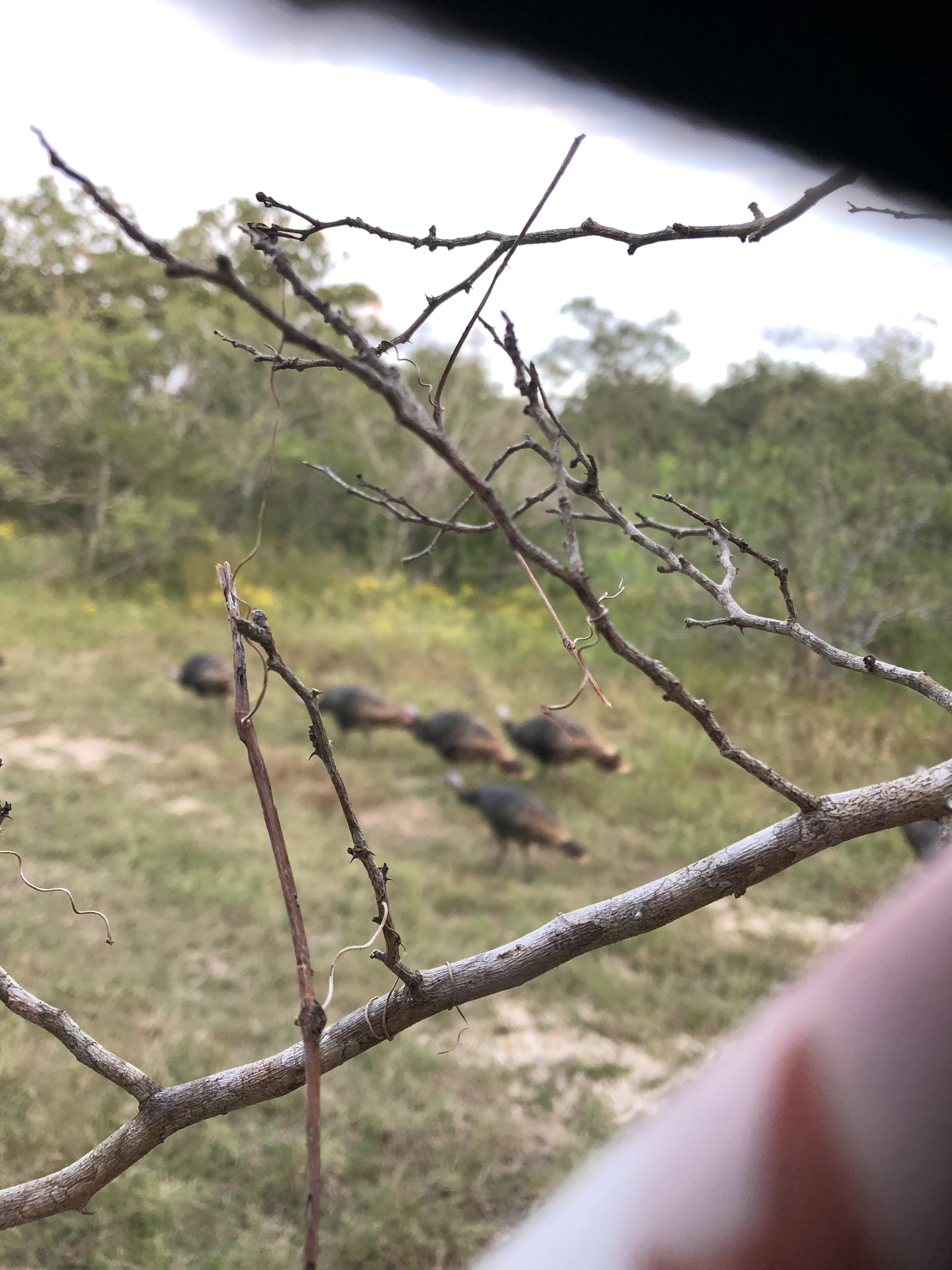 Out of the quiet, windy morning, a gobble rang out and we froze. Before I could process how close it was, clucks erupted from the trees on the other side of the fence where we stacked the wood. We dropped to the ground as 10 turkey hens swarmed the little feeder in the trees with militaristic precision.