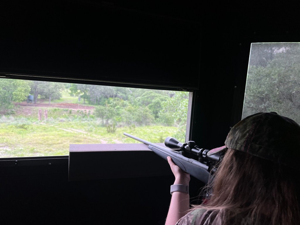 When we got there, she set me up under a tree with a stumpy stick that made for the perfect rifle rest looking down into a clearing with small clumps of trees scattered along the hillside. With my rifle loaded and my sites confirmed in multiple places along the tree line, all we could do was wait.