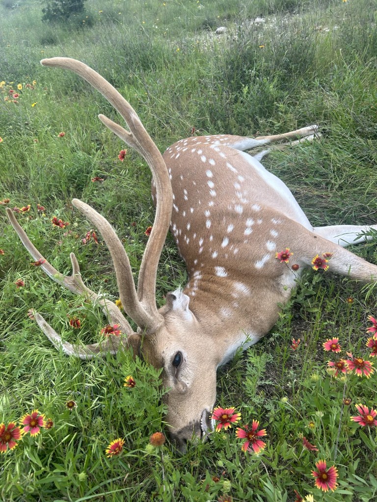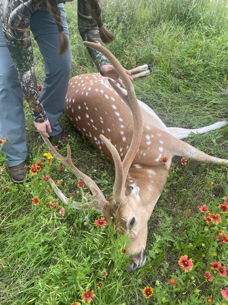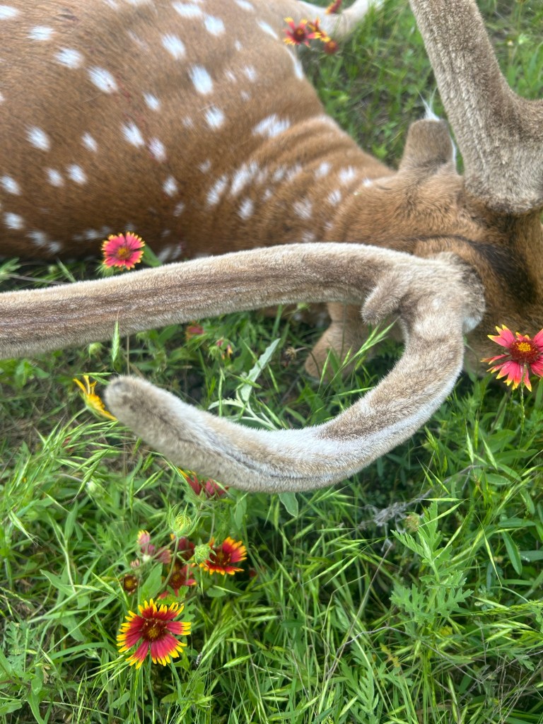 I knew he was big from the stand, but I marveled at how much bigger was up close. The bases of his antlers were so thick that I couldn’t get my hand all the way around them, and the little extra point I had seen through my scope was a lot bigger than I had realized! And then, there were his ears, maybe half of what he once had with a clean line. Shaun explained that with all of the freezes in Texas lately, they often found axis deer with frost bitten ears, but never quite like this! We decided he had to be old enough to have lived through the big freeze of 2021, when Texas nearly froze solid without power. And along his neck, there were scars in his spotted hide from challenging and fighting rivals.