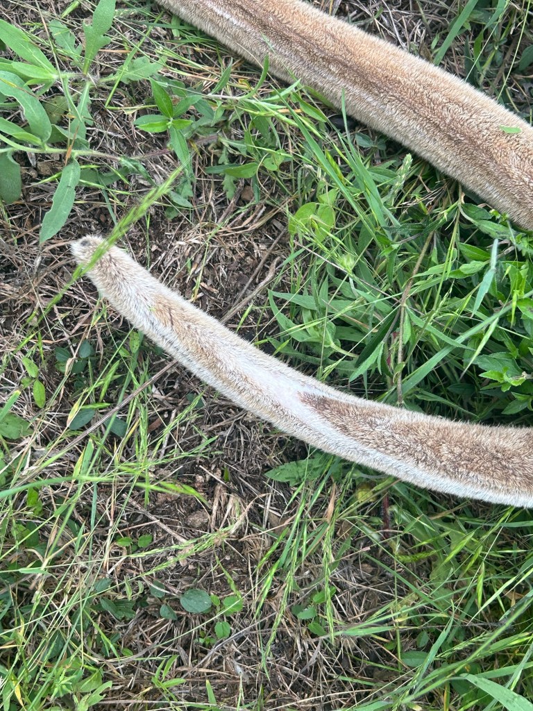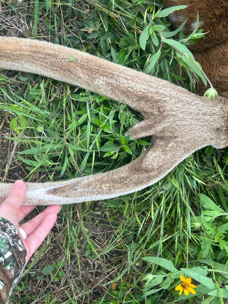 To see one of these creatures up close, this ghost of an animal that I had been chasing all weekend… There are still no words, even as I’m writing this. He was even more beautiful and perfect up close, and something pricked behind my eyes as I ran my hand along his marbled velvet antlers. I marveled at the softness and the lines where the velvet was slowly peeling away already; one more week, and my velvet axis would’ve had hard horns.
