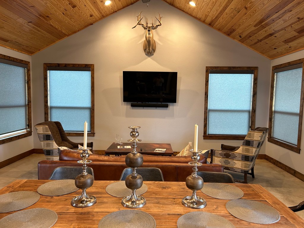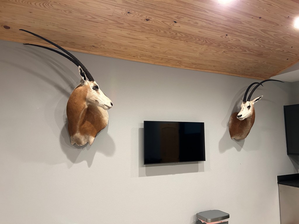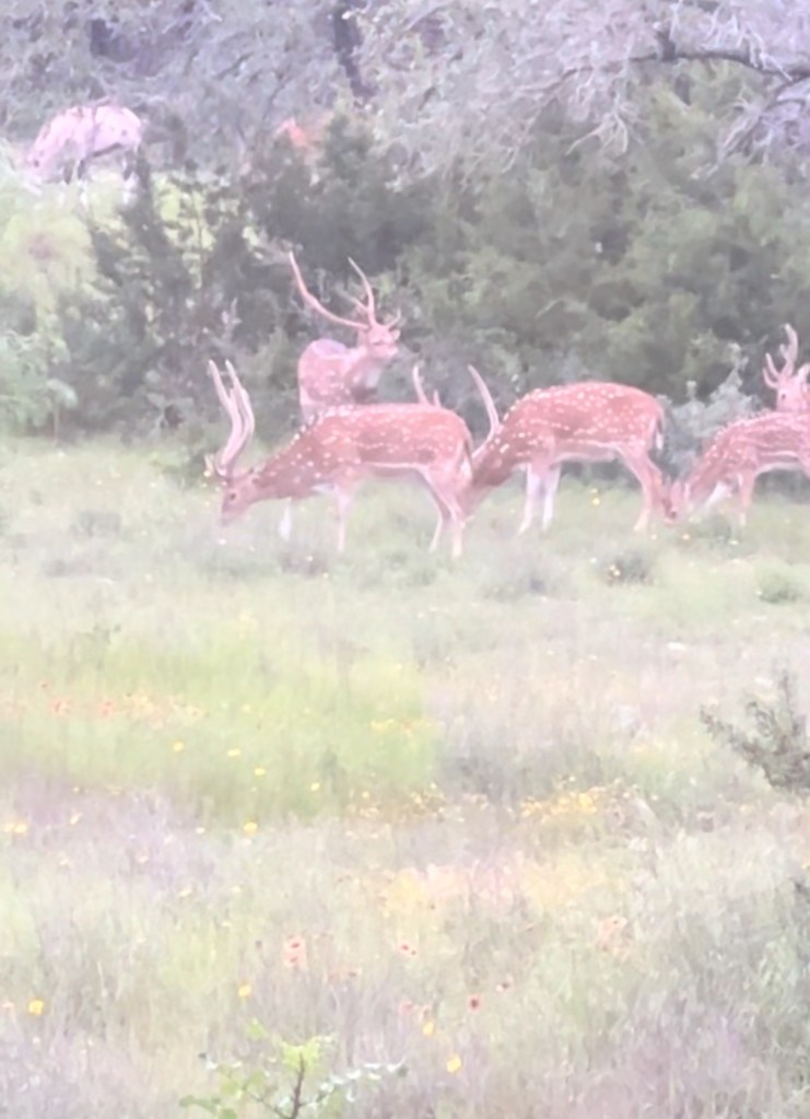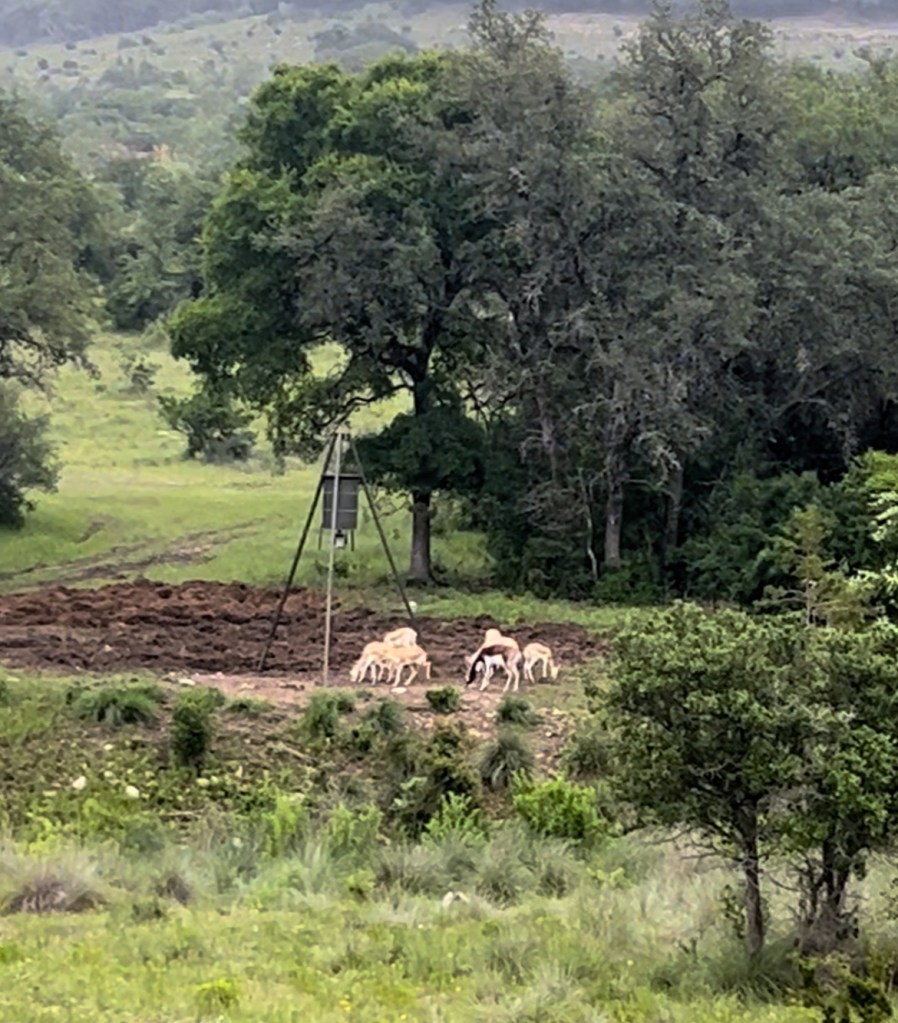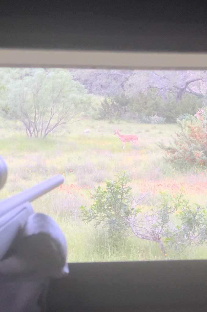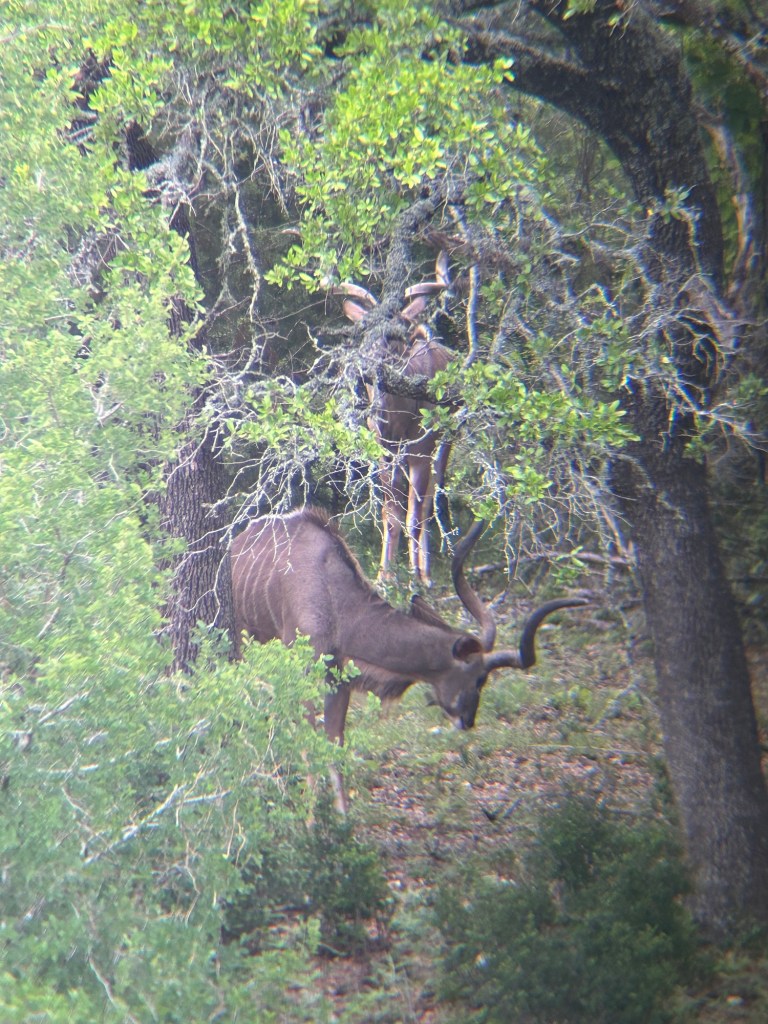 Animals started pouring out of the trees in every direction. Axis deer, gemsbok, blackbuck, whitetail, wild turkey, and Court frantically texted us about axis deer coming down from the top of the hill. But neither of were looking at our phones because axis bucks have just started pouring out of the trees. This isn’t just a large herd, it’s the large herd with the shooter bucks that they had hoped to find. Everywhere I looked as I got my rifle situated out the window, there were enormous axis deer bucks wandering through the bushes. As quickly as Kate could attempt to point them out without whispering too loudly, I watched new ones emerge.