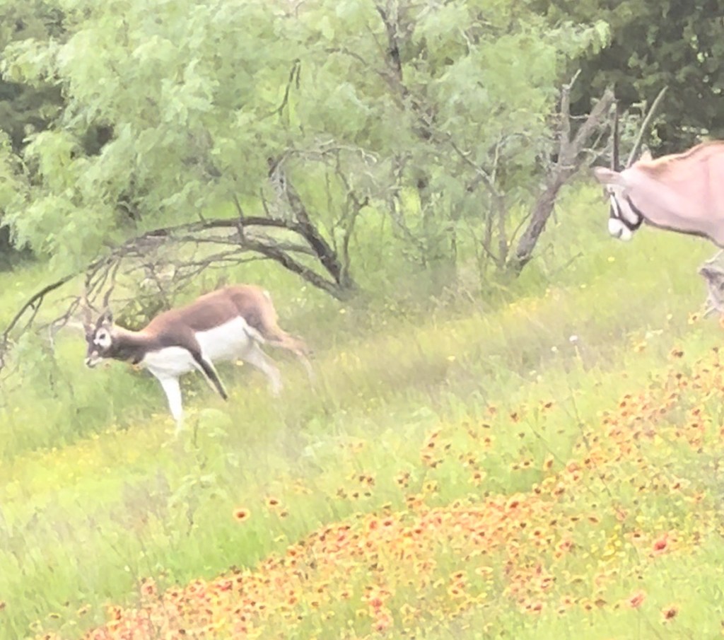 Sure enough, as I slowly turned my head to the right, there were a handful of enormous gemsbok wandering behind the blackbuck herd along the hillside. And right behind them, peering carefully from the trees, were axis deer.
